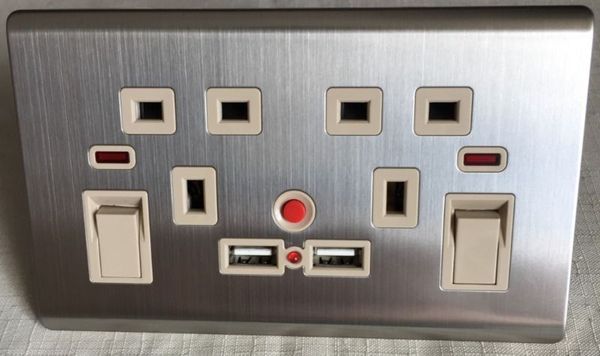 2 Way/Gang Brushed Stainless Steel UK Mains 3 Pin Plug